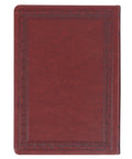 An intricate floral frame adorns the cover of the saddle tan faux leather Bible. The gold-foiled title, set atop the heat-debossed version reference, strikes a beautiful contrast to the rich brown cover and matches the gold gilt-edged page edges.