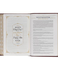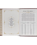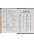 Inside, the pages are printed in black ink and adorned with metallic gold decorative accents. The durable construction ensures a lay-flat spine, and the Bible is equipped with two satin ribbon markers and a thumb index for easy navigation. The text is formatted in a double-column format and presented in a clear 9.8-point type.