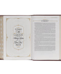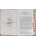 The Bible is elegantly covered in a smooth saddle tan full grain leather, with a striking gold-foiled title gracing the front cover.