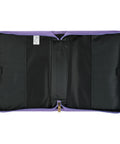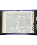 A purple zipper with a gold metal zipper pull that is engraved with a cross securely closes the front and back covers and matches the gold-toned metal handle hardware. The handle folds completely flat when the Bible cover is open to allow for easy reading.
