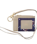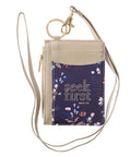 The ID holder has plenty of organizational space, with 3 slip pockets for credit cards, 2 multi-purpose pockets and a fabric lined zippered pocket for change. The faux leather is topstitched to give it strength for frequent use. The ID pocket, located on the back, is trimmed in the same material as the navy floral slip pocket on the front. A detachable strap is attached to the cardholder by golden split ring hardware and a clasp. The split metaling is sturdy enough to hold additional keys, fobs, or charms.Handy and fashionable, this ID holder would be a wonderful gift for a daughter in college or high school who needs to keep her student ID always at hand. It would also serve well as a sleek replacement for a wallet. Pop the Seek First Taupe and Navy Faux Leather ID Card Holder in your favorite teacher or nurse's stocking stuffer at Christmas, or add it to a graduation gift for a recent grad.- Taupe Body with Navy Floral Accents and Panels