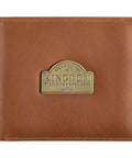 The smooth saddle tan genuine leather wallet is decorated with a brass badge that is centered on the front cover and engraved with the sentiment.