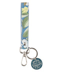 The cornflower blue faux leather wrist strap features a fresh botanical print in soft shades of green, white, and yellow. This cheerful look is finished with white topstitching and a silver metal stud that neatly fastens the looped ends. A silver metal swivel clasp is looped to the wrist strap, which makes it easy to clip onto a bag or belt loop. A silver split key ring is attached to the swivel clasp to keep your keys or small essentials right where you need them. Dangling from the key ring is a round silver metal epoxy-filled medallion charm in a deep teal color. It features the silver Scripture verse in a modern hand-lettered style.