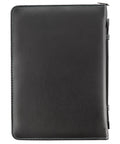 There is an exterior zipper with a silver cross engraved zipper-pull, a convenient lay-flat spine handle and 2 interior pen loops.