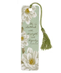 Large white magnolia flowers with golden centers adorn the mottled green background of the cardstock bookmark. The sentiment is written beside it in black scripted letters.