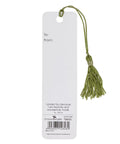 An olive green tassel attached to the top center of the bookmark makes it easy to locate in a book.