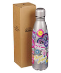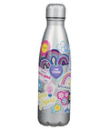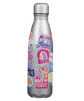 The silver stainless steel water bottle is covered in colorful fun sticker decals that feature shapes from hearts and flowers to rainbows and butterflies. Multiple sentiments are presented in bright, fun designs and letters.