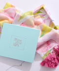 This sheer, whimsical, flowing scarf features gentle grapefruit, yellow, and green citrus leaves that create a kaleidoscope of color. Pink grapefruit-colored tassels complete the look. A light blue gift box printed in full color with the Citrus Leaves pattern on the interior provides a stunning way to present his scarf. The gift box features a rose gold-foiled frame that holds the rose gold-foiled sentiment.