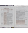 Luxury features of this Bible include a presentation page, gilt-edged pages, ribbon markers, a thumb index, and an index of authors and articles featured in the back. The presentation page in the front can be personalized and states the premise for the design of this beautiful Bible.