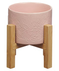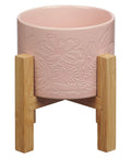 The pink ceramic planter pot features a detailed debossed floral design, with intricate flowers and leaves embossed into the ceramic. The design adds texture to the otherwise smooth ceramic pot. The planter sits securely on a minimalist bamboo stand, which elevates it off the surface. The bamboo stand has a natural wood finish with four legs that cross underneath the planter to provide stability.