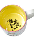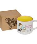 With a clean white exterior and a retro decal, the Sorry I'm Late Ceramic Coffee Mug has a fun vibe that will make you smugly laugh out loud even if you're home by yourself! The first half of the sentiment is written in light pink letters to match the mug's rim, and the rest is written in black cursive lettering. The mug's interior is a bright yellow and contains a Bless Your Soul imprint at the bottom to go with the rest of the mugs in this line.
