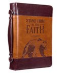 The message of the Stand Firm Two-tone Brown Faux Leather Classic Bible Cover is bold and straightforward: Take courage and stand firm! Any Christian man would be proud to carry his Bible in this Classic Bible Cover with its classic, masculine design. The artwork, along with the sentiment, encourages steadfastness in the life of the believer.