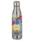 The stainless steel water bottle has a bright-colored sticker design, highlighting uplifting and positive messages and inspirational Scripture verses.