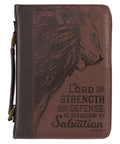 True strength comes from the Lord. This handsome Strength and Defense Walnut-Brown Faux Leather Classic Bible Cover makes a powerful statement while keeping your Bible protected and your notes secure. The stunning artistic rendering of a lion conveys a sense of courage and strength that will encourage you in your faith.