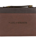The Strength and Defense Walnut-Brown Faux Leather Classic Bible Cover is part of the Strength and Defense Walnut-Brown Lion Collection, which includes a ceramic coffee mug, a faux leather journal, a faux leather bookmark, a metal keychain, a faux leather Bible case, a hardcover notebook with an elastic closure, and a deluxe gift Bible.