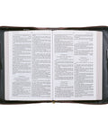 A convenient lay-flat spine handle, attached with brass metal handle hardware, enables the Bible case to open completely. A brass metal zipper has a cross-engraved brass metal zipper pull and closes smoothly to keep your Bible secure and protect it from wear and tear. On the inside are 2 pen loops to hold a pen or a highlighter and 2 slip pockets to hold the covers of your Bible securely.