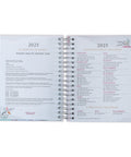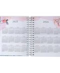 A beautiful presentation page welcomes you to the journal and is followed by an index of international holidays for 2025. Also included in the front of the planner are two year-at-a-glance views of 2025 and 2026. Each month is introduced with a unique design and an inspirational quote. A month-at-a-glance view of each month with space for notes precedes the weekly planning pages. Each weekday is separated into morning and afternoon sections, while weekends have a smaller footprint that features the entire day. These pages also include space for to-do lists, a month-at-a-glance mini calendar, and notes.