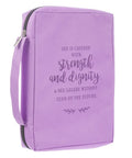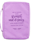 The Strength And Dignity Bible Cover is the perfect gift for the woman who is striving to be a Proverbs 31 woman. Printed on the front of this Strength And Dignity Bible Cover is Proverbs 31:25, which says, “She is clothed with strength and dignity, and she laughs without fear of the future.” Scripture describes a strong woman as one who has nothing to fear in what lies ahead because her complete trust is in the Lord. The lavender tone of this Bible cover gives it a royal feel, reminding you that you are royalty in the eyes of the Lord.