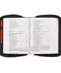 The poly-canvas material of this Bible cover makes it easy to clean and durable, withstanding daily wear and tear. Inside pockets and a pen loop allow for easy note-taking. The lay-flat spine handle also allows for easy reading.