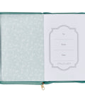 Experience the perfect combination of functionality and style with the Strength and Dignity Misty Teal Faux Leather Journal. Featuring a convenient zipper closure, this journal provides a secure space for your thoughts and ensures the safekeeping of loose papers or cherished mementos.