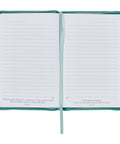 This journal has 336 lined pages, each featuring a Bible verse at the bottom. For added convenience, there's a space at the top right corner of every page for jotting down dates or titles. To make your writing experience more seamless, a teal satin ribbon marker is thoughtfully attached to the spine, making it effortless to locate your last entry.