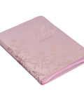 The front cover of the pink faux leather journal showcases a stunning gold-foiled garden rising from its bottom edge. The title is gold-foiled in the top right corner and is underscored by the heat-debossed Scripture reference.