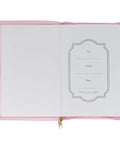 The Flexcover journal offers the perfect blend of durability and flexibility. It has a secure zipper closure with a pink zipper and a sturdy gold metal zipper pull that ensures that all 366 lined pages are protected from damage and kept private. Each page has a Bible verse at the bottom. The journal also includes a presentation page that can be personalized when it is given as a gift and a satin ribbon marker to help you easily access your most recent entry.