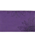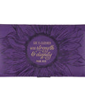 An oversized heat debossed sunflower fills the front cover of the purple faux leather checkbook cover. It spills over the spine onto the back cover, where it meets another heat debossed sunflower in the lower left-hand corner. Gold foiled words from Scripture in delicate cursive, rest in the flower’s center.