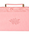 Beautiful pink rose outlines are heat-debossed on the front and back covers of the pink Bible case. A heat-debossed frame on the front panel contains the eat0debossed sentiment that is accented with gold-foiled letters.