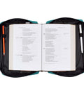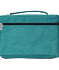 The teal Bible cover is constructed from a durable, water-resistant poly-canvas material that can endure a lot of handling. The front cover is screen printed in black with Scripture taken from the Book of Proverbs.