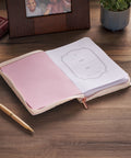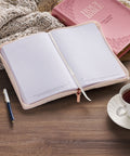A blush pink zipper is secured with a rose gold metal zipper pull to ensure all your notes are securely stored inside. A presentation page at the front of the journal can be personalized to turn it into a gift. Inside are 366 lined pages, each with a Scripture verse printed at h the bottom. There is also an attached ribbon marker to mark your page.