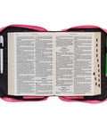 A silver cross-engraved zipper pull attached to a sturdy zipper securely closes the Bible case, and a lay-flat handle constructed from the same material as the Bible case folds neatly away so that the Bible can open flat. A slip pocket on the back is handy for storing notes and church bulletins, and two interior pen loops keep a pen and pencil or highlighter at the ready.