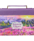 The Strength & Dignity Purple Landscape Faux Leather Fashion Bible Cover is the perfect way for a woman of God to protect her Bible—a woman who is strong yet gentle, wise yet kind.A deep purple faux leather back panel wraps around the spine of the Bible case and meets a colorful panel screen printed with a vivid sun drenched landscape where yellow sunbeams shine over a purple mountain range illuminating a pink flower field. The sentiment is presented in a sophisticated purple font held by an ornately shaped off-white frame set in the middle of the picture.