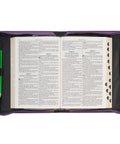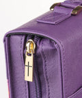 The back panel holds a handy slip pocket that you can use to store your bulletin or Bible study notes. Topstitching around the edges adds to the durability of the design and serves as a coordinating element. Gold metal hardware attaches a lay-flat handle to the spine and coordinates with the engraved zipper pull. This Bible cover is available in two sizes: medium and large. Please refer to the last image in the image carousel on the left for the Bible Cover Sizing Chart before you make a selection.Ideal for birthdays and holidays, this Bible cover is a unique gift that you can pair with a coordinating pen set or even a bouquet of flowers to create a beautiful gift. An artistic friend or coworker who embodies what it means to be a godly woman would undoubtedly love to carry her Bible in the Strength & Dignity Purple Landscape Faux Leather Fashion Bible Cover.
