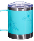 The camp-style mug's teal powder coated exterior is laser engraved with a floral design and text. Silver outlined petunias grace the sides of the mug and frame the text.
