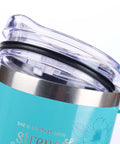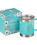 The serene feel of the Strength & Dignity Teal Camp-style Stainless Steel Mug reflects the essence of a woman who has placed her trust in God and trusts him with her future.