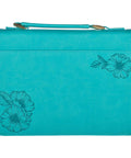 The Strength & Dignity Teal Faux Leather Fashion Bible Cover is a reminder that you can face the future with confidence when you put your trust in the LORD. The teal Bible cover is constructed of smooth faux leather. Heat debossed vines of flowers frame the sentiment on the front panel of the teal faux leather Bible cover, while the back panel features two debossed floral accents. The sentiment is heat debossed and partially gold foiled.