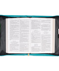 Gold metal hardware attaches a teal faux leather lay-flat handle to the spine allowing the Bible cover to open fully when in use. A coordinating gold zipper pull, engraved with a cross, smoothly closes a teal zipper. A slip pocket on the back panel is useful to stash notes and small notebooks. Keep a pen or highlighter handy with the 2 pen loops found on the inside of the Bible cover. This Bible cover is available in three sizes: medium, large, and extra-large. Please refer to the last image in the image carousel on the left for the Bible Cover Sizing Chart before selecting a size.The Strength & Dignity Teal Faux Leather Fashion Bible Cover is part of the Proverbs 31 Collection that includes a stainless steel travel mug, a faux leather bookmark, a faux leather checkbook cover, and a faux leather journal. The Strength & Dignity Teal Faux Leather Fashion Bible Cover will inspire a young newly-married woman or new mom to commit their lives to Christ. The Strength & Dignity Teal Faux Leather Fashion Bible Cover can also be paired with a coordinating journal or stainless steel travel mug and given as a gift of appreciation for a small group leader or a Bible study leader who models wisdom. - Teal Faux Leather