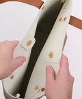 The body of this tote is a soft cream felt material that will be easy on the books or Bible you carry in it. Gold-colored metallic studs secure the toffee-colored faux leather handles, and a magnetic snap closure securely closes to keep your Bible, notebooks, and pens from falling out. A 3.5 x 9 base allows the tote bag to stand upright. The roomy tote stands about 12 inches high, and its widest measurement is about 13 inches wide, providing plenty of space for all your belongings.