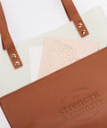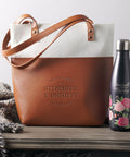 The soft cream-colored felt interior of the tote bag is encased in and protected by a toffee-colored faux leather wrap covering two-thirds of the tote and doubling as exterior pockets. The sentiment is heat-debossed on the front faux leather pocket in a classic font.