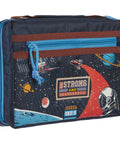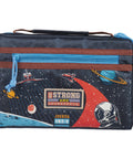 The dark blue polyester Bible case is covered in an exciting space adventure decal that features stars, planets, a spaceship, and an astronaut. A tan rubber patch is appliqued to the center of the design, and it is embossed with raised tan letters and red, blue, and yellow accents. The Scripture reference is printed as part of the cover design right below it.