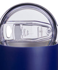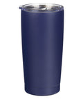 The double-wall insulation and stainless steel interior ensure that warm drinks stay warm and cold drinks stay cold for up to 24 hours! The matte navy blue powder-coated finish feels comfortable to the touch and stays cool no matter how hot your drink is. A snugly fitting clear plastic lid with a retractable sip-hole closure keeps beverages from leaking, splashing, or spilling. The tumbler holds 18 fluid ounces of hot or cold liquid. We recommend hand-washing the tumbler in warm, soapy water.