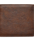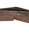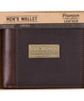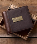 - Two-tone walnut brown and dark brown full grain leather wallet with brass plate