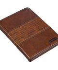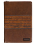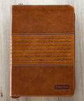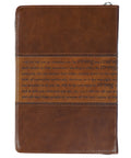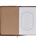 This zipped closure, two-toned brown flexcover journal features inspirational Scripture on the subject of strength and courage from Joshua 1:5-7 & 9. The Scripture is beautifully scripted in debossed text, wrapping from front to back. There is an attached ribbon page marker. The journal cover is constructed of quality man-made material imported from Italy, with the look and feel of real leather (trade name LuxLeather).