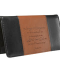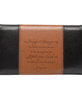 Features Scripture from Joshua 1:9 in debossed text. This black & tan two-tone checkbook cover is constructed of quality man-made material imported from Italy, with the look and feel of real leather (trade name LuxLeather).