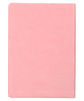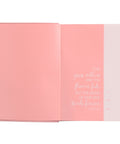 On the front of its sunrise pink faux leather cover, the devotional Bible showcases an exquisite abstract branch adorned with heat-debossed leaves and florals, all gracefully outlined in shimmering rose gold foil. Just to the right of the branch is the heat-debossed title.