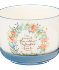 Let the Sweet Friendship Bright Floral Wreath Ceramic Planter with Saucer be a beautiful way to let a dear friend know just how much she means to you. With its soft florals and heartfelt Scripture, this planter is a gentle, everyday reminder of the joy and comfort found in true friendship.