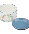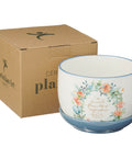 The planter rests in a coordinating sky-blue saucer. A drainage hole at the base allows excess water to escape, and the detachable saucer helps protect surfaces from moisture. The planter's interior is finished in the same glossy ivory glaze as the exterior. It comes packaged in a full-color gift box—ready to bless a friend who has blessed you.