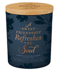 The Sweet Friendship Fresh Lotus Blossom Scented Candle in a Glass Jar is part of the A Sweet Friendship Watercolor Garden Collection. This collection includes a scented candle in a glass jar, a wirebound journal, a ceramic coffee mug, a metal keychain in a tin, and a gift bag.