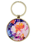 The gold-toned keychain has a round pendant with a vibrant, abstract, watercolored floral design in shades of pink, purple, orange, and blue. The artwork is sealed under a glossy epoxy finish, creating a smooth, polished surface. The sentiment is stamped on the back of the gold metal medallion.